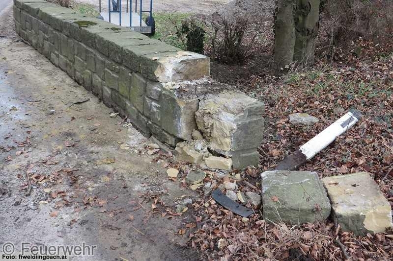 Aus unbekannter Ursache verlor der Fahrzeuglenker die Kontrolle über sein Fahrzeug und fuhr in eine Steinmauer. Am Fahrzeug entstand erheblicher Sachschaden, der Lenker blieb unverletzt. Mittels Wagenheber wurde der Pkw auf Rangierrollen gehoben und gesichert abgestellt. Danach wurde die Straße von Flüssigkeiten und Wrackteilen gesäubert.