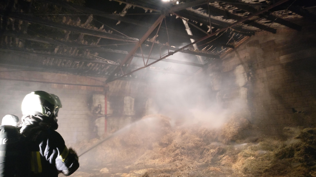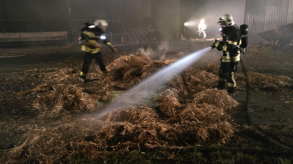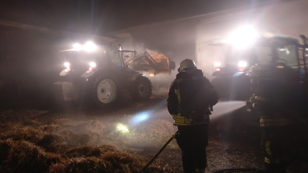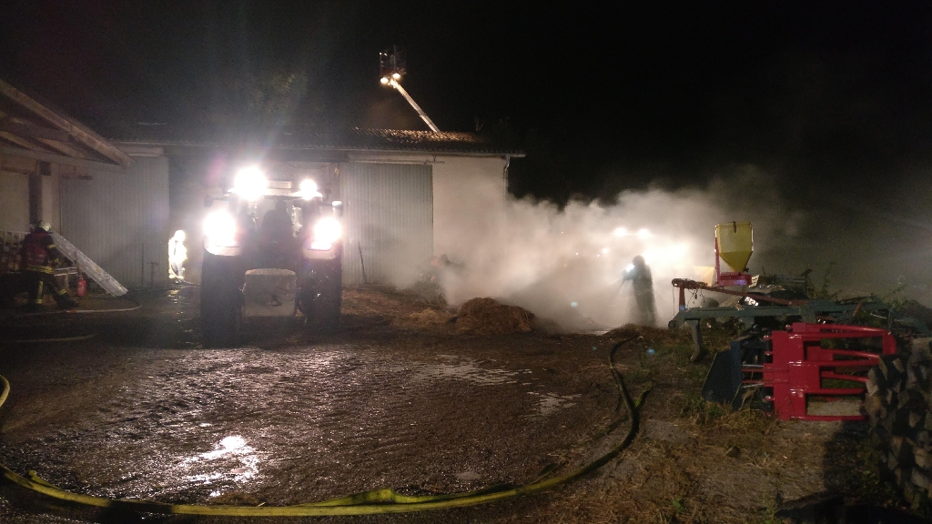 Mit Atemschutztrupps wurde das Feuer in der Halle unter Kontrolle gebracht. Traktoren verteilten anschließend das Stroh im Freien wo weitere Trupps Glutnester bekämpften. Mit vereinten Kräften konnte ein Ausbreiten auf die angrenzenden Gebäude verhindert und gegen Mitternacht Brand Aus gemeldet werden.