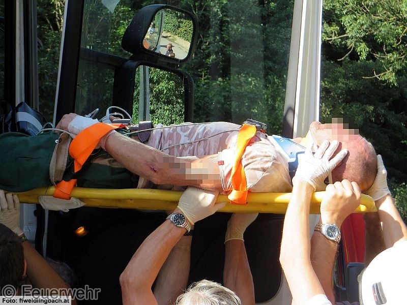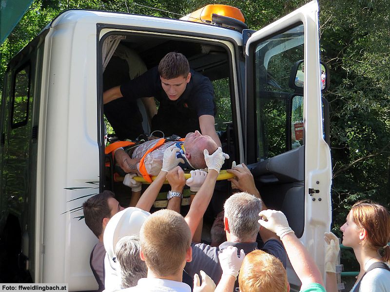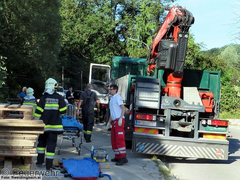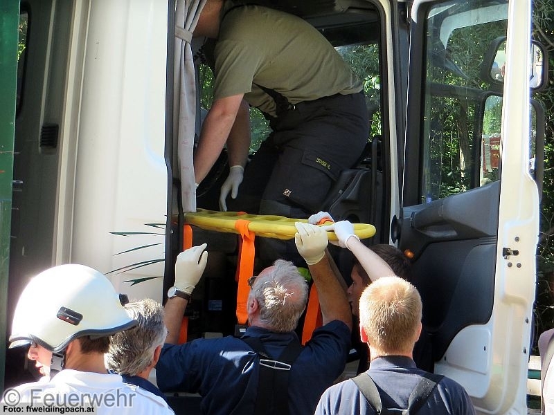 Ein Lkw-Fahrer fiel beim Bedienen des Ladekrans unglücklich auf die Unterseite seines Brustkorbs, sodass er sich verletzte. Im Schock suchte er Schutz in seinem Fahrersitz, so dass es die dann anschließend doch noch verständigten Rotkreuzleute nicht mehr schafften, ihn schonend in ein nahegelegenes Spital zu bringen, weil der Mann nicht zu bewegen war.