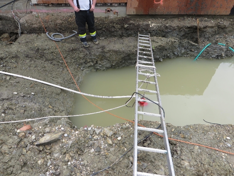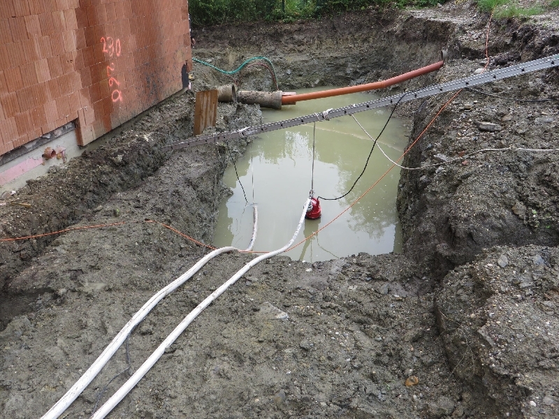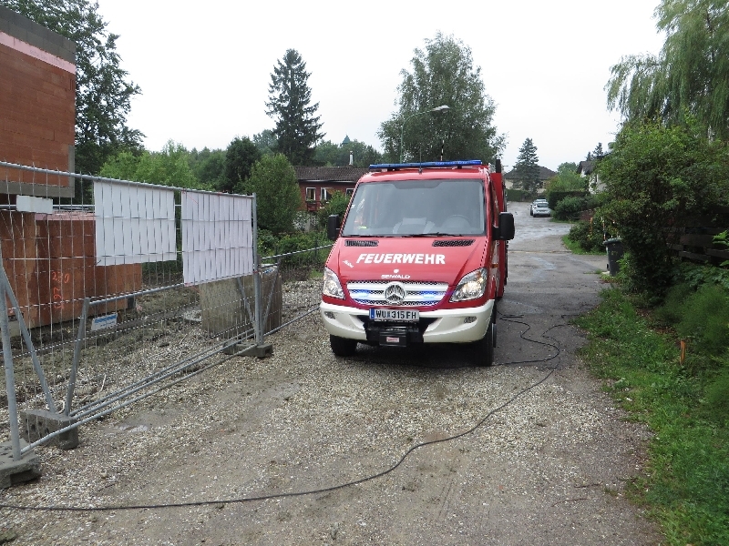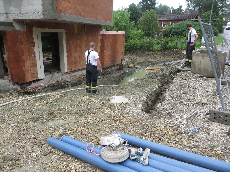 Nach massiven Regenfällen, standen ein Keller sowie eine Baugrube, eines sich im Bau befindlichen Hauses, unter Wasser. Durch die überflutete Baugrube, bestand auch eine Einsturzgefahr.