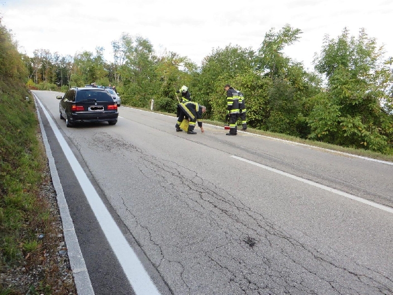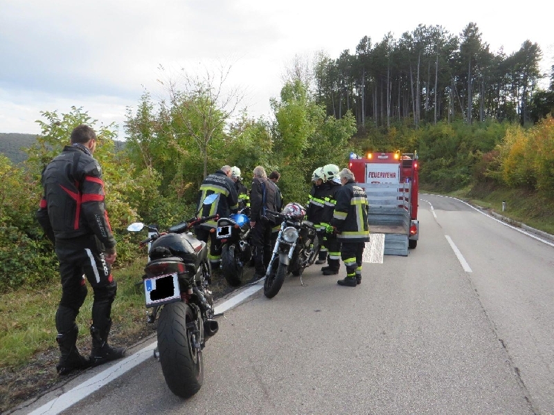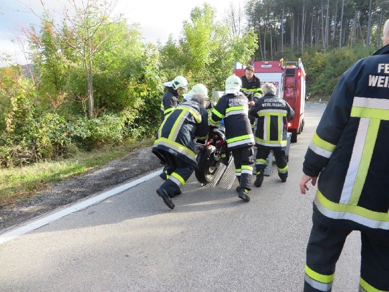 Ein Motorradfahrer kam zu Sturz und zog sich dabei Verletzungen unbestimmten Grades zu. Das Motorrad wurde von der ausgerückten Mannschaft geborgen und mit Hilfe des Anhängers von der Unfallstelle verbracht und gesichert abgestellt. Anschließend wurde noch die Ölspur gebunden und Ölspurtafeln aufgestellt.