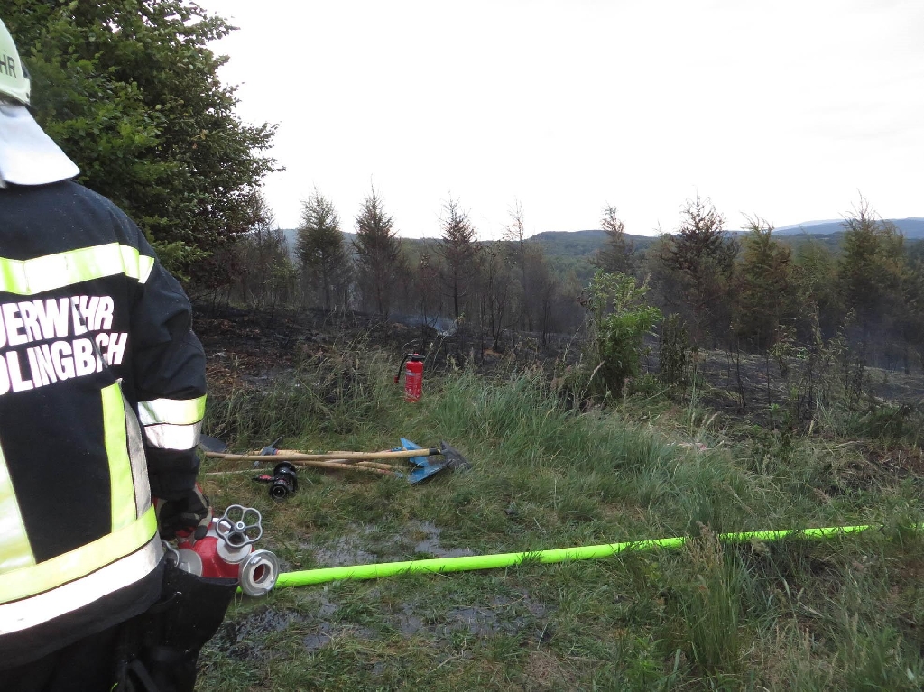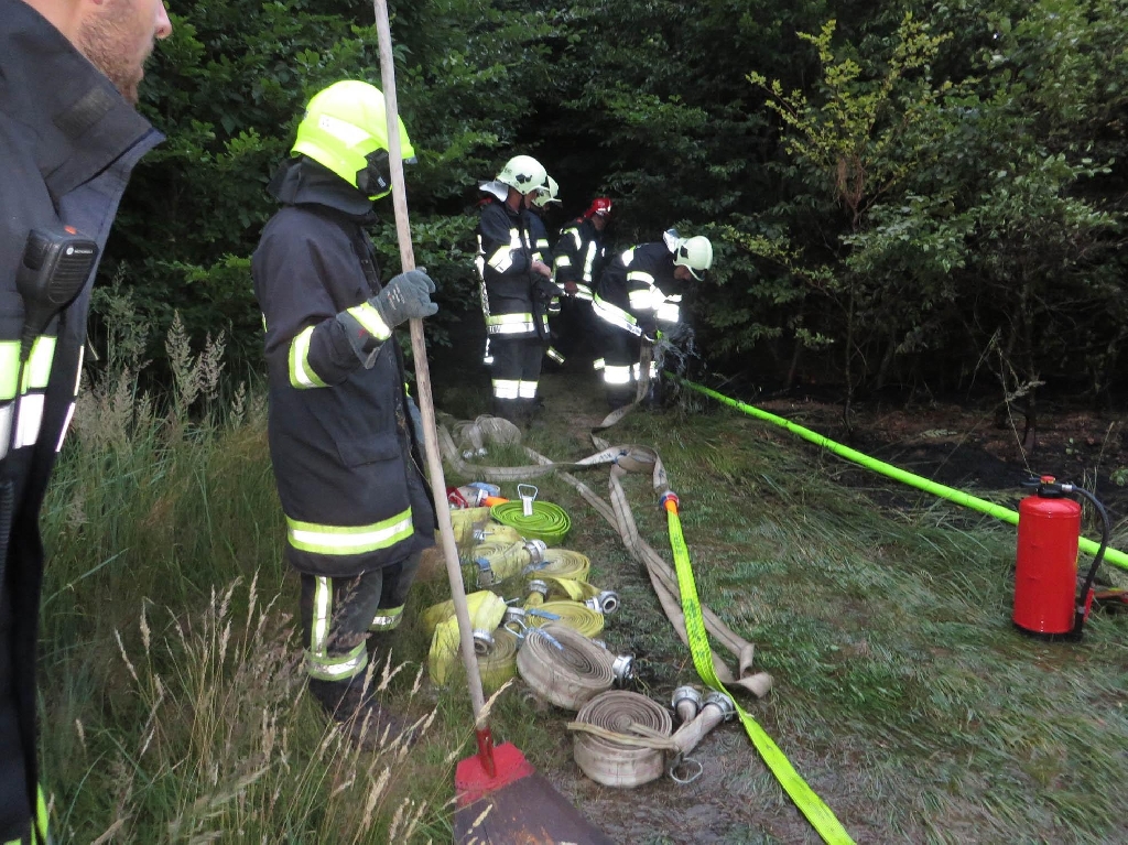 Zunächst wurde mit Feuerpatschen, Krampen und Schaufeln eine Ausbreitung des Brandes verhindert. Zeitgleich begann das Verlegen der Schlauchleitung. Da der Einsatzort nur über einen ca. 200 Meter langen Waldweg erreichbar war, mussten folglich mehrere hundert Meter verlegt werden, um die Wasserversorgung sicherzustellen. Der Brand wurde von zwei Seiten eingegrenzt und unter Einsatz von teils schwerem Atemschutz und massiver Wassermengen gelöscht. Als nützlich erwiesen sich dabei auch Wärmebildkameras mit deren Hilfe Glutnester rasch erkannt wurden. Nach rund zwei Stunden konnte „Brand aus“ gemeldet werden.